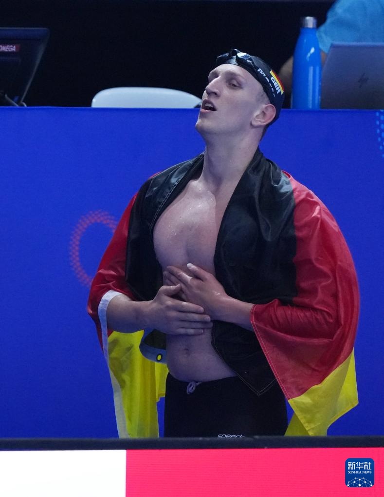 7月27日,德國選手梅爾滕斯在比賽后慶祝奪冠。新華社記者 雒圓 攝