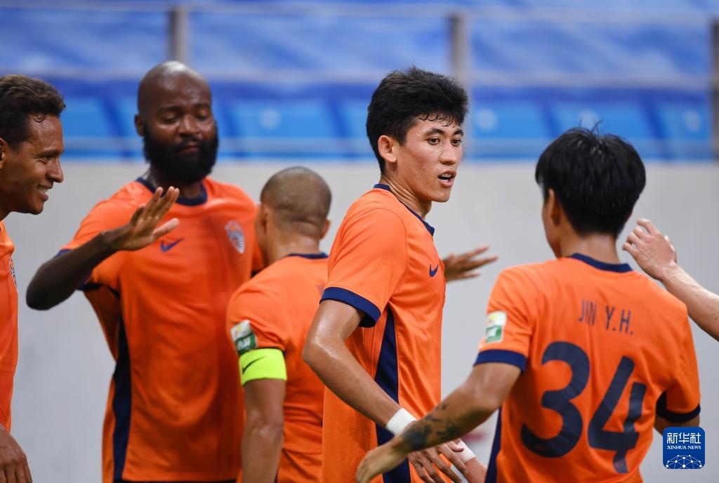 7月27日,青島海牛隊球員在比賽中慶祝進球。新華社記者 李紫恒 攝