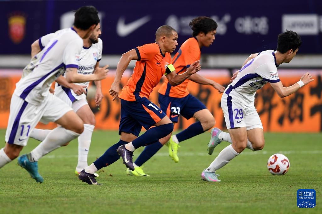 7月27日,青島海牛隊球員奧古斯托(前右)在比賽中射門。新華社記者 李紫恒 攝