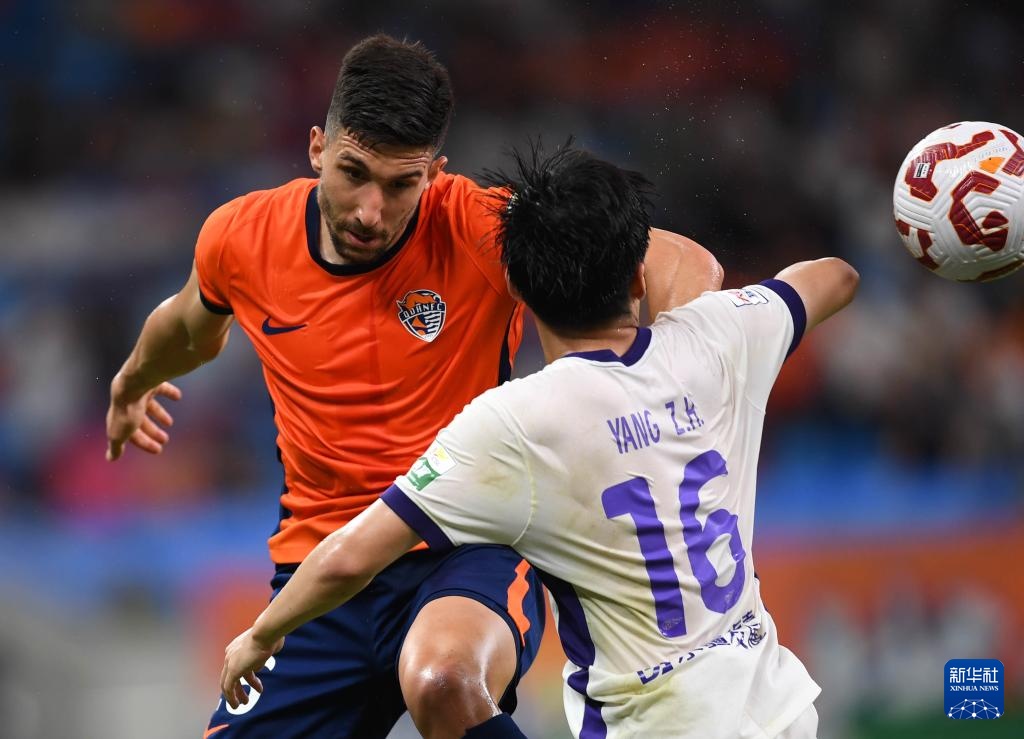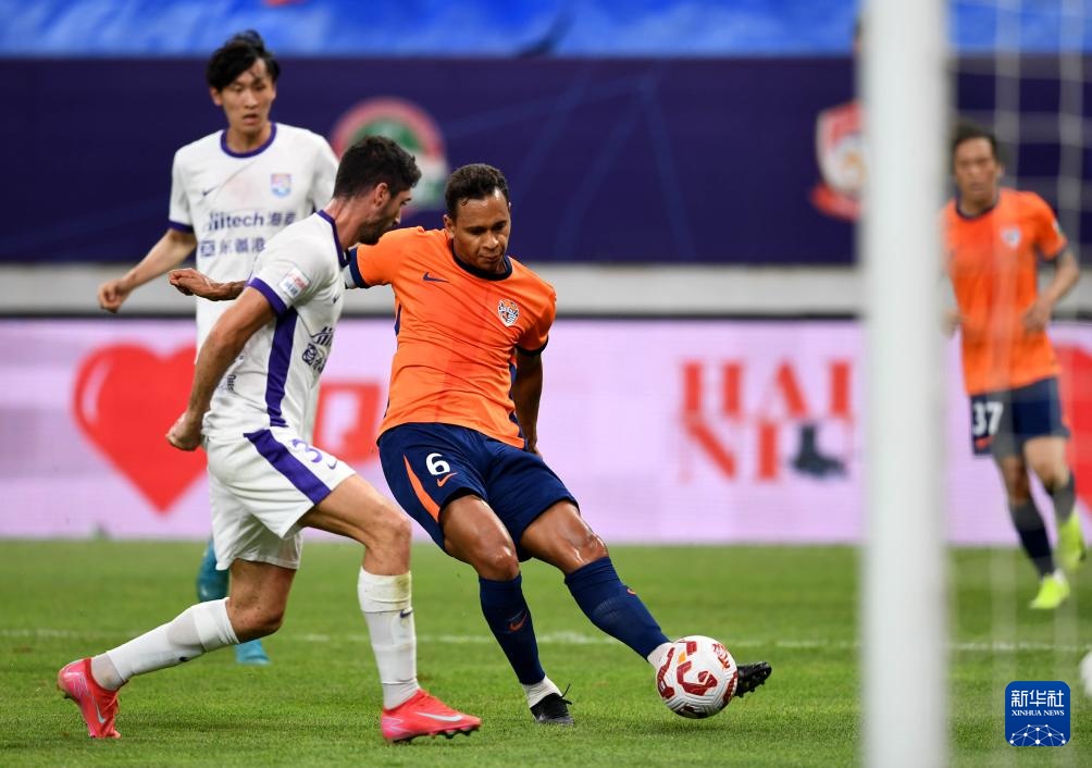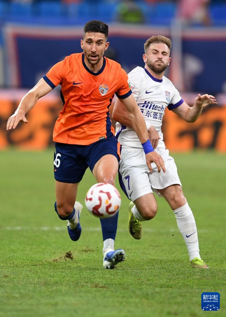 7月27日,青島海牛隊球員尼古拉(左)與天津津門虎隊球員阿代米拼搶。新華社記者 李紫恒 攝
