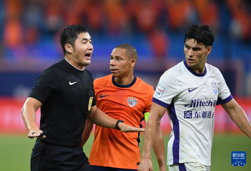 7月27日,主裁判徐強強(左)在比賽中與球員交流。新華社記者 李紫恒 攝