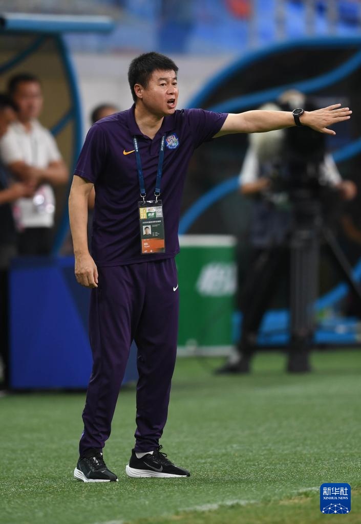 7月27日,天津津門虎隊主教練于根偉在場邊指導球員。新華社記者 李紫恒 攝