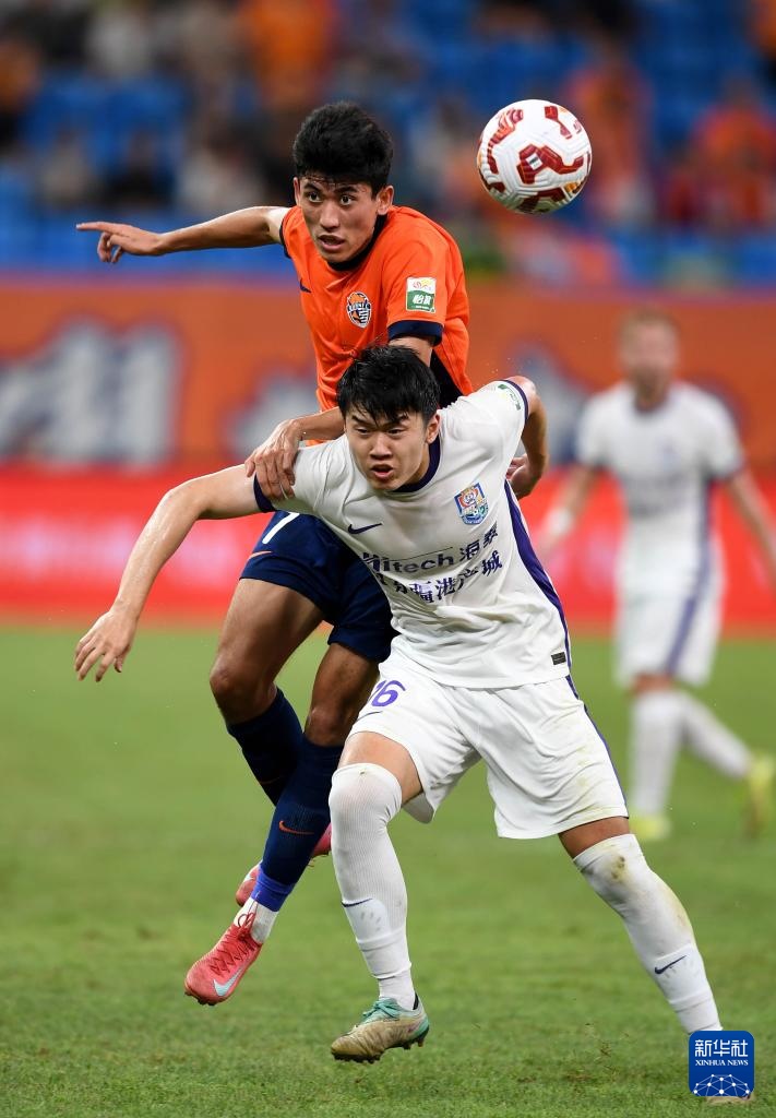 7月27日,天津津門虎隊球員楊梓豪(前)與青島海牛隊球員買烏郎·米吉提爭頂。新華社記者 李紫恒 攝