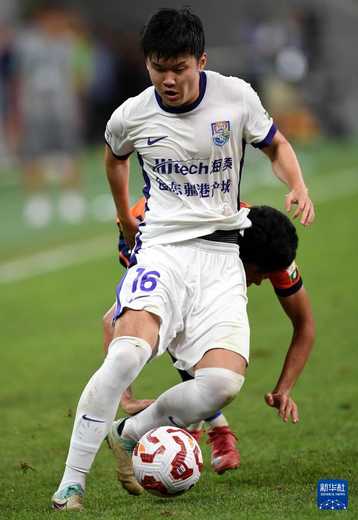 7月27日,天津津門虎隊球員楊梓豪(前)在比賽中帶球突破。新華社記者 李紫恒 攝