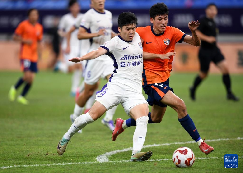 7月27日,天津津門虎隊球員楊梓豪(前左)與青島海牛隊球員買烏郎·米吉提拼搶。新華社記者 李紫恒 攝