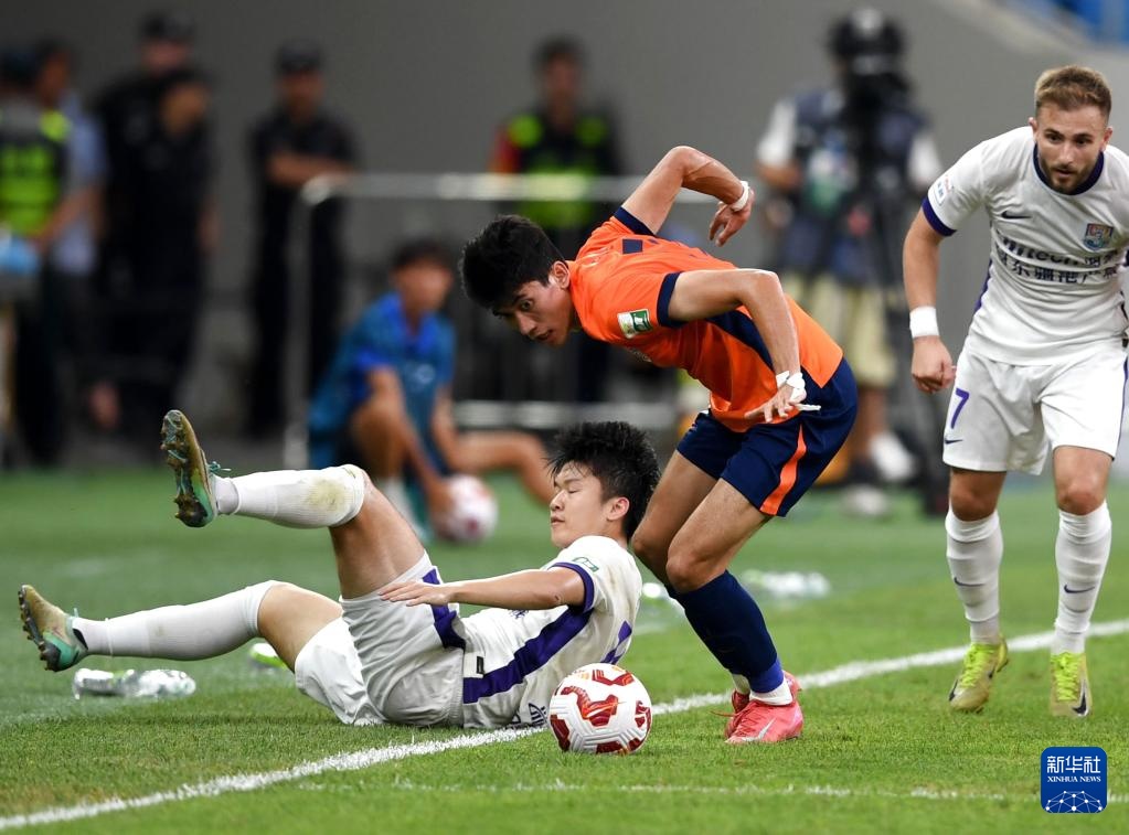 7月27日,青島海牛隊球員尼古拉(左)與天津津門虎隊球員楊梓豪拼搶。新華社記者 李紫恒 攝
