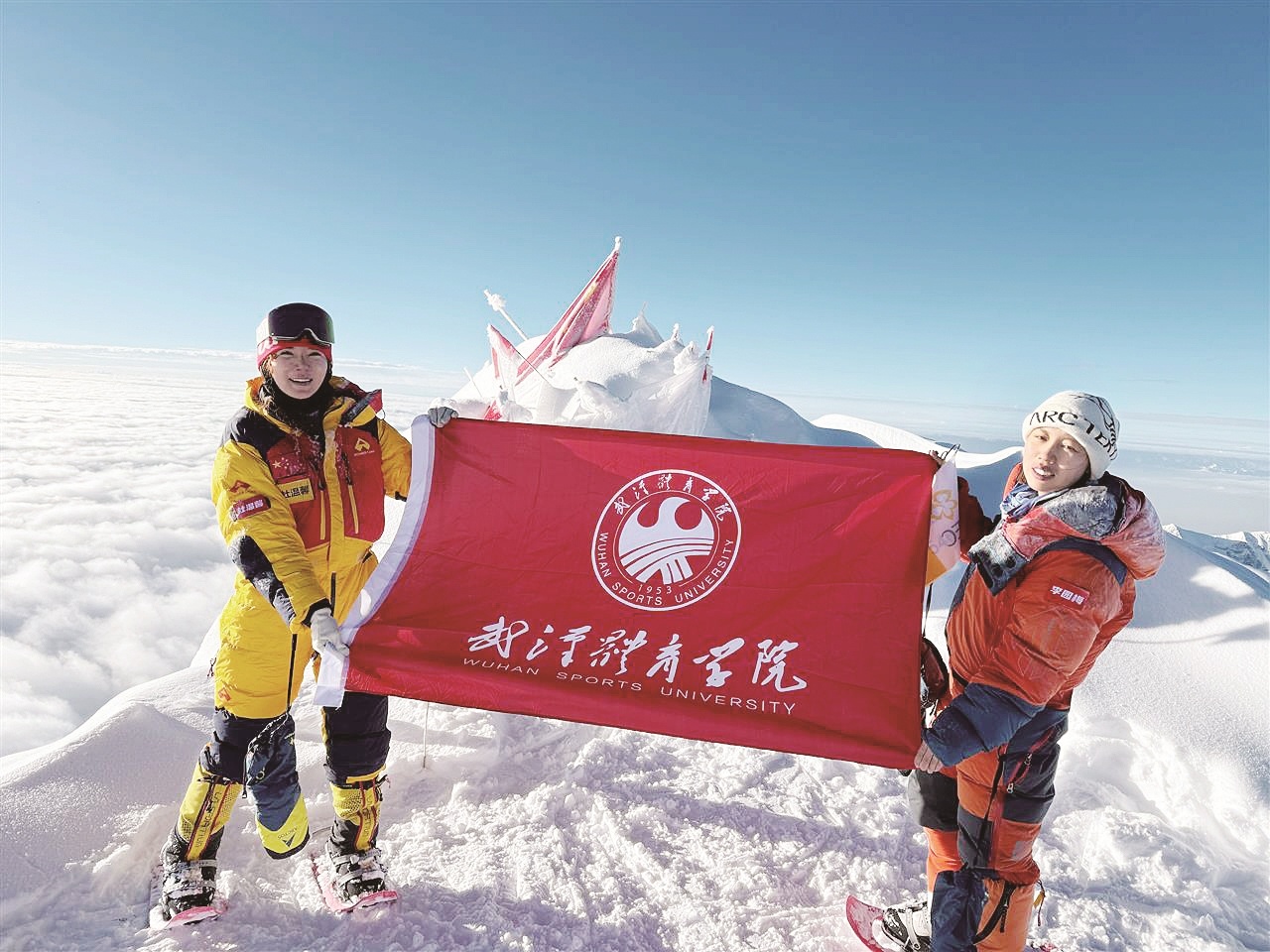7月24日清晨,武漢體育學院新聞傳播學院碩士研究生杜溫馨成功登頂新疆慕士塔格峰。慕士塔格峰海拔7546米,冰川規模龐大,曾被視為冰川“源頭”“始祖”,被稱為“冰川之父”。去年6月,杜溫馨接觸登山運動,開始在專業教練指導下投入訓練,并完成“三天五岳”挑戰。今年她將目光轉向更具挑戰性的雪山,先后成功登頂海拔5396米的哈巴雪山、6178米的玉珠峰。圖為杜溫馨(左)在慕士塔格峰頂留影。