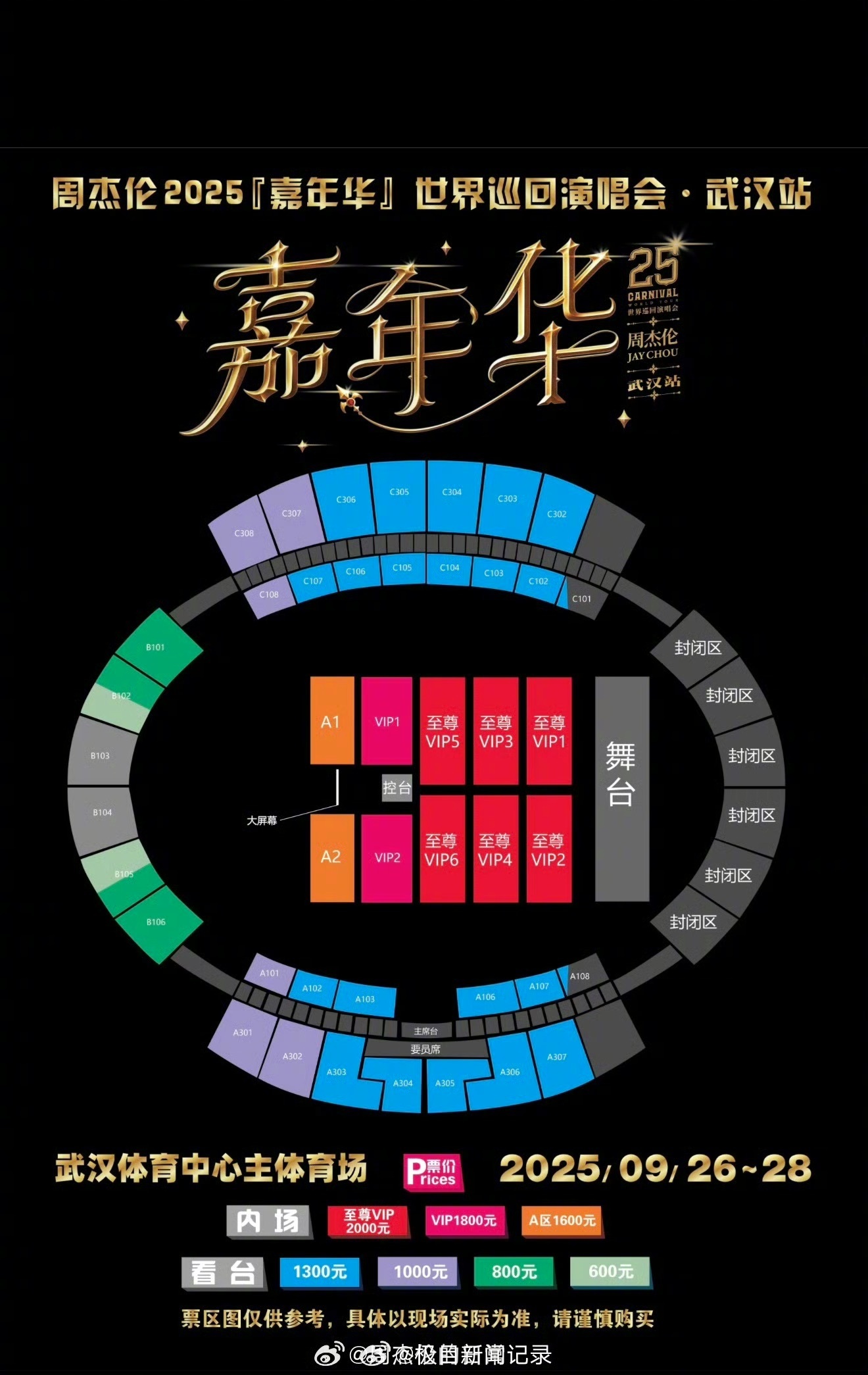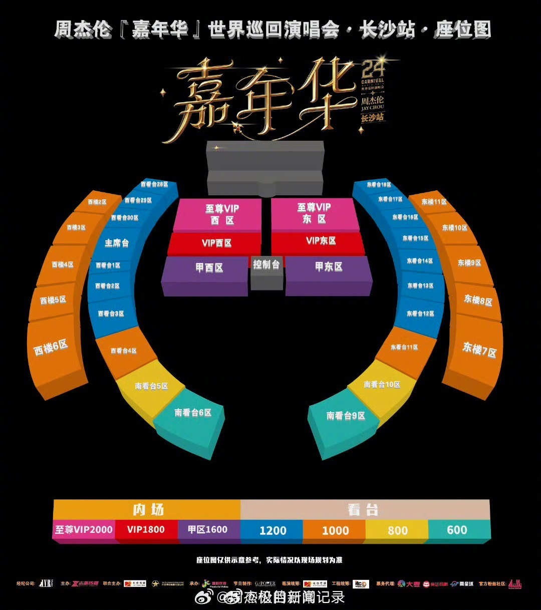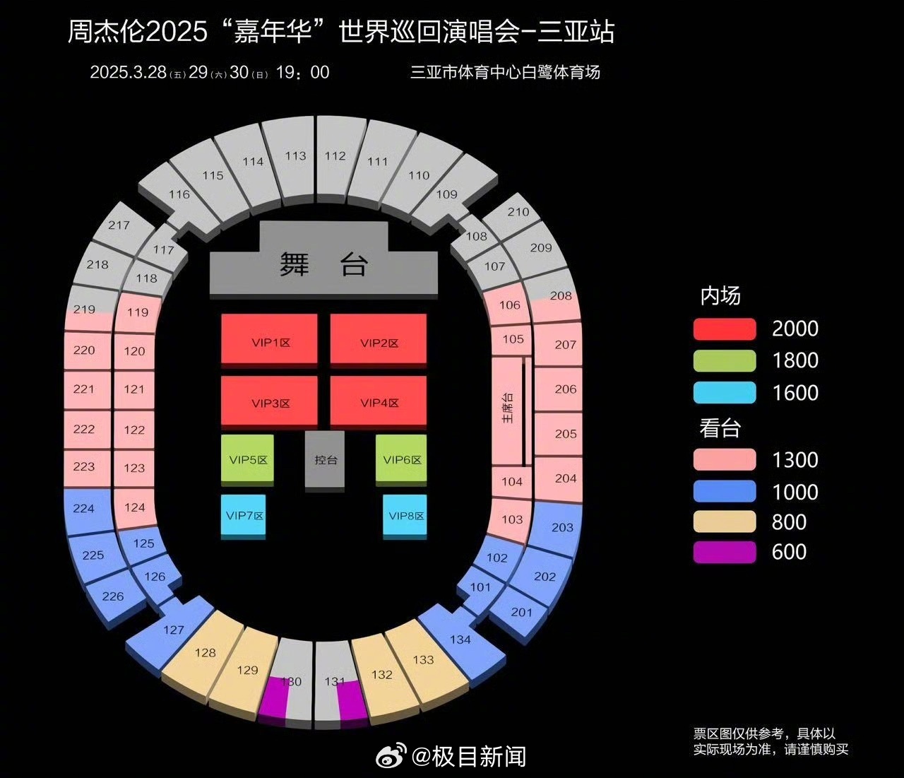 還有不少網友給出了周杰倫廈門站、南寧站、三亞站、長沙站的票圖對比,表示武漢站的票圖“格外離譜”。@極目新聞 記者關注到,廈門站、南寧站、三亞站中,同屬2000元的至尊VIP板塊均為4塊,長沙站則為兩塊。而1800元、1600元內場票,幾站演唱會對應的區域類似。