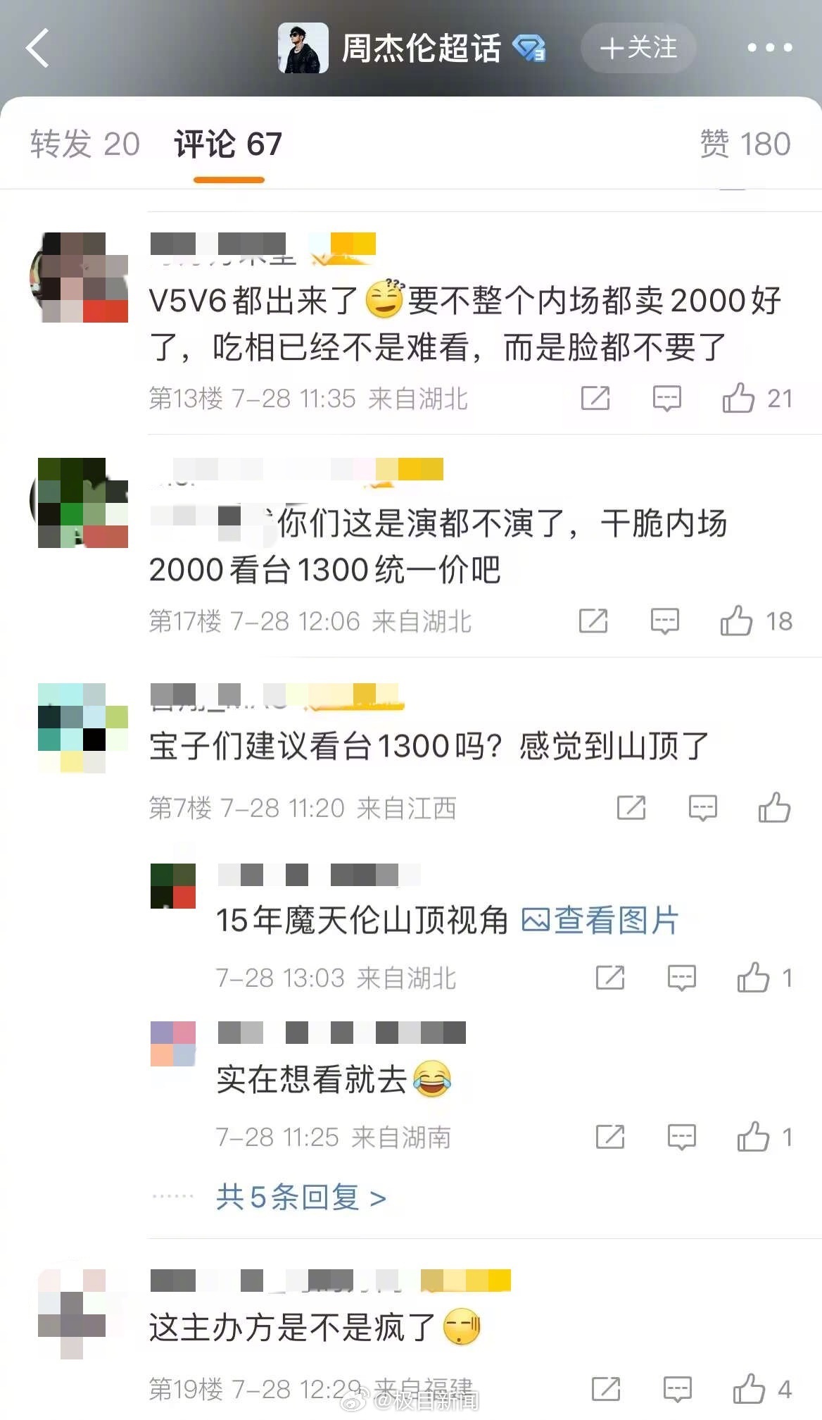 時隔10年再來武漢的周杰倫演唱會,今日13:14將開啟搶票模式。而就在29日上午,極目新聞記者關注到,許多網友在社交平臺反映周杰倫2025”嘉年華“演唱會武漢站”吃相難看“,原因是,售價2000元的”至尊VIP“內場票檔被劃分出了6塊區域,靠近中控臺、在體育場內很可能肉眼看不清周杰倫樣子的VIP坐席,賣到了1800元,內場中靠近大屏幕的A區票,買到了1600元。也有網友表示:1300元的看臺,很可能會被“發配至山頂”。