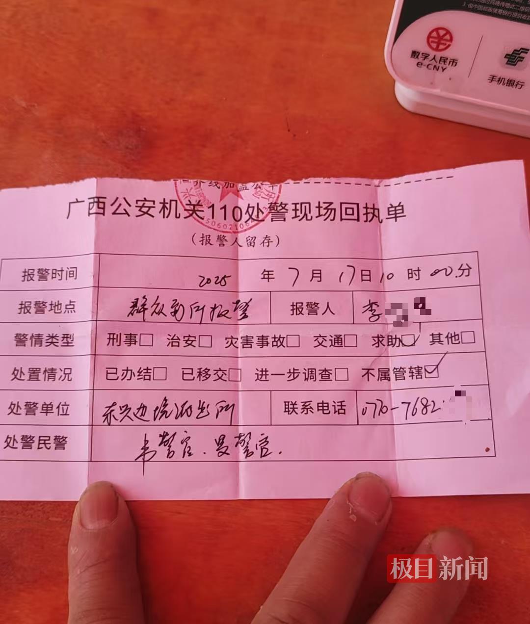 李尉標最后出現在監控中是在東興市深溝社區,廣西公安機關110處警現場回執單顯示,李先生到東興邊境派出所求助,處置情況是“不屬管轄”。