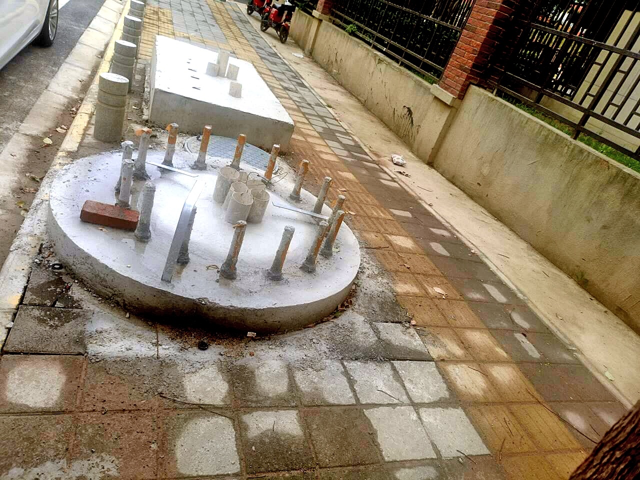 小區業主張先生向極目新聞反映稱,7月上旬,小區西門外的白沙小路人行道上,一處地塊突然被施工圍擋封閉。由于天氣炎熱,施工方選擇在夜間進行作業,因此一開始并未引起太多居民注意。然而,一兩個星期后,當圍擋拆除時,兩個大水泥基座赫然出現在人行道中央,嚴重影響居民出行。