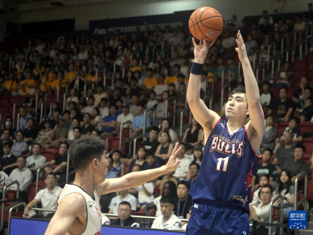 7月29日,香港金牛隊球員盧藝文(右)在比賽中投籃。新華社發(盧炳輝攝)