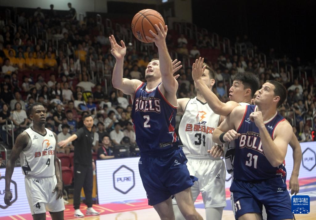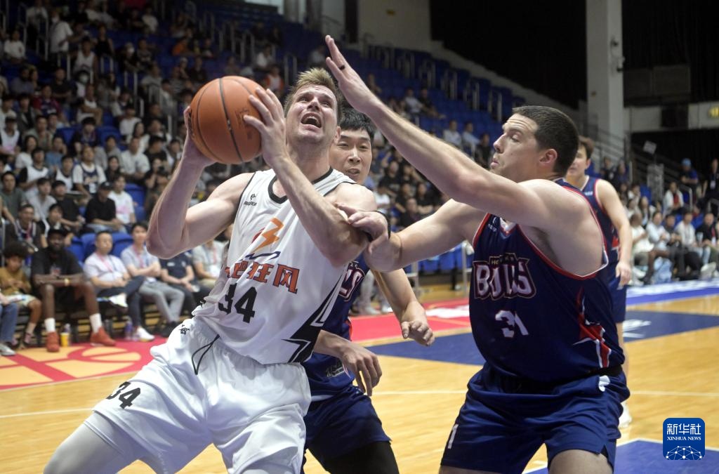 7月29日,香港金牛隊球員大衛·詹姆斯(右)防守合肥狂風峻茂隊球員阿格拉瓦尼斯。新華社發(盧炳輝攝)