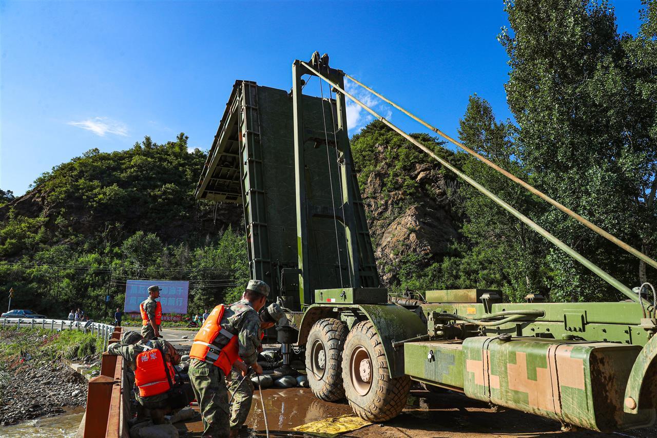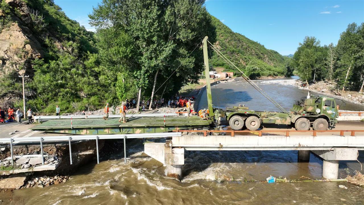 當救援隊伍抵近營子村時,一座被攔腰折斷的橋梁橫亙在官兵面前。受洪水影響,這座王北溝門橋的橋面被沖毀,殘余的橋墩搖搖欲墜,湍急的河流肆意奔騰,任務分隊指揮員眉頭緊鎖、語氣堅定:“橋梁分隊,架橋!”