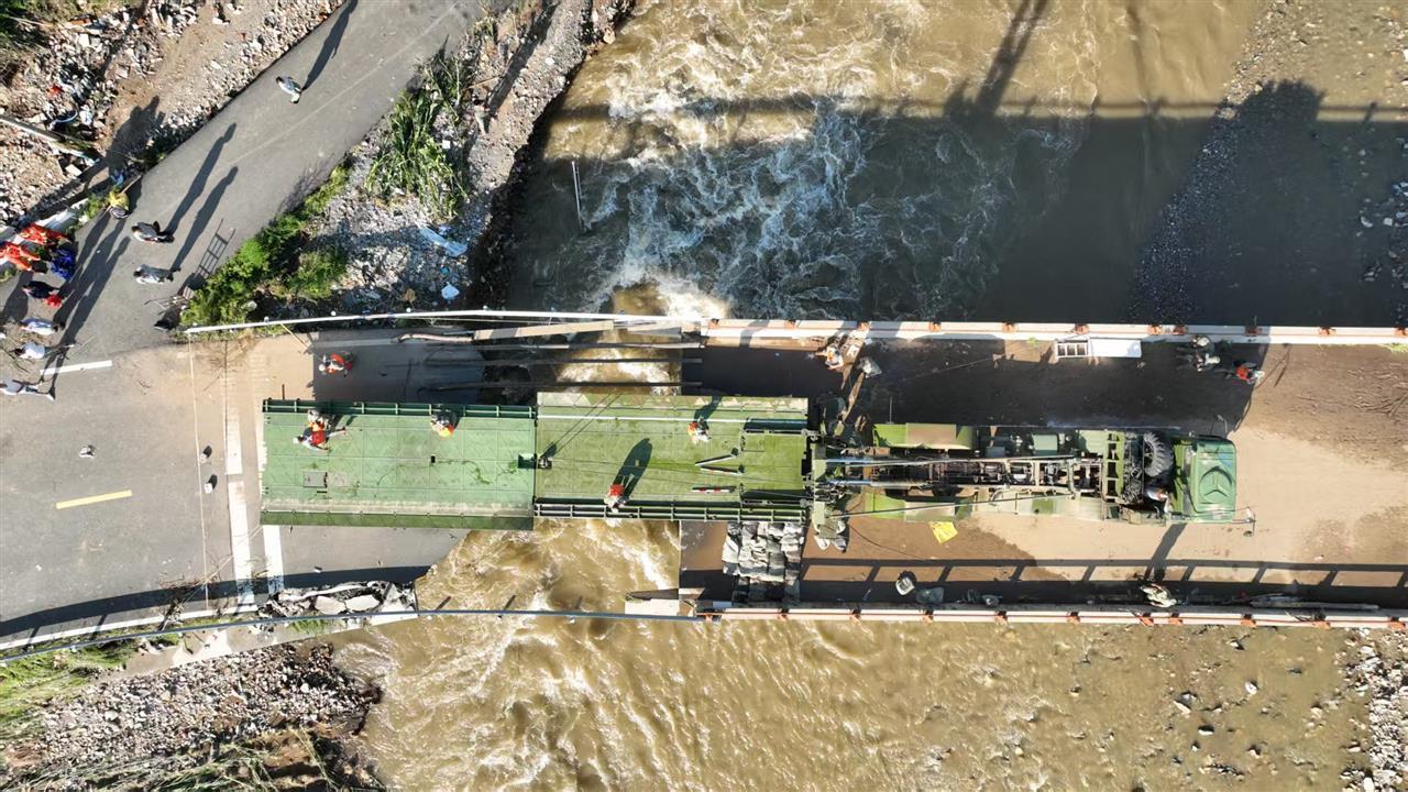 在哪兒架橋、怎樣架橋又成了一個新問題。指揮員侯松雷當機立斷:“災情就是命令,時間就是生命,我們必須爭分奪秒!”他帶領連隊骨干認真研判風險、周密制定計劃,最終決定在原有橋梁上進行架設,并在橋梁上下游關鍵位置設置三處觀察哨與兩處應急救護組,全程嚴密監控水流變化,確保安全的前提下,盡可能節省時間。