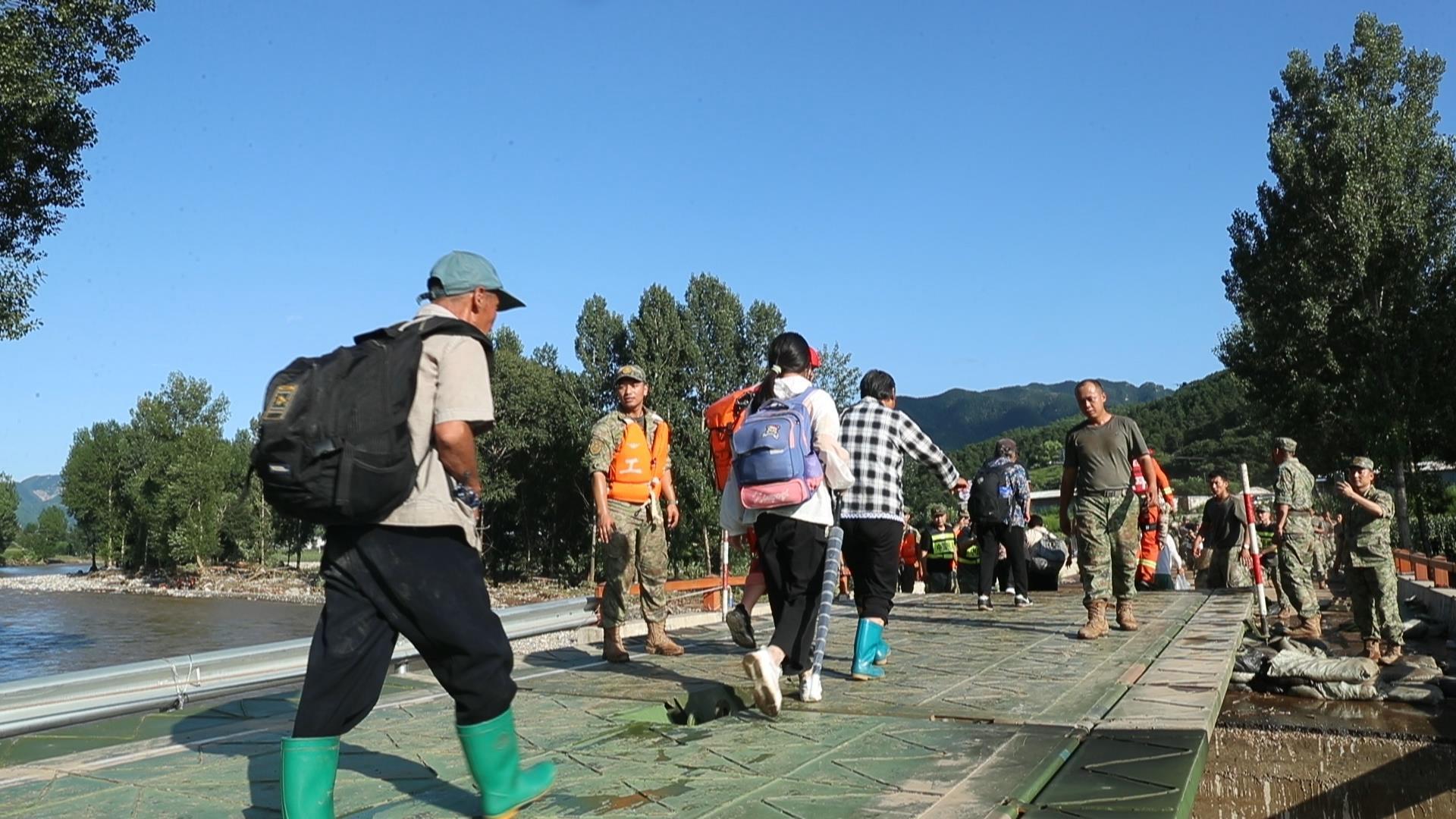 7月29日17時許,在河北省承德市灤平縣馬營子滿族鄉,一座“鋼鐵大橋”橫跨被洪水沖毀的王北溝門橋兩岸,西溝村百余名受困群眾相互攙扶,踏上這條剛剛搶通的“生命通道”。