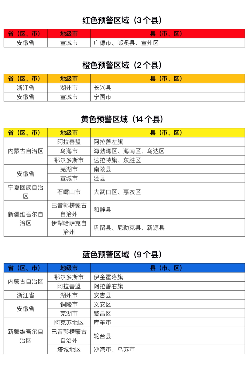 人民網(wǎng)北京7月30日電 (記者歐陽易佳)水利部和中國氣象局7月30日18時聯(lián)合發(fā)布紅色山洪災(zāi)害氣象預(yù)警:預(yù)計(jì),7月30日20時至7月31日20時,浙江西北部、安徽東南部等地部分地區(qū)發(fā)生山洪災(zāi)害可能性大(橙色預(yù)警),其中,安徽東南部局地發(fā)生山洪災(zāi)害可能性很大(紅色預(yù)警),預(yù)警區(qū)域涉及的縣(市、區(qū))見下表。其他地區(qū)也可能因局地短歷時強(qiáng)降水引發(fā)山洪災(zāi)害,請各地注意做好實(shí)時監(jiān)測、防汛預(yù)警和轉(zhuǎn)移避險等防范工作。