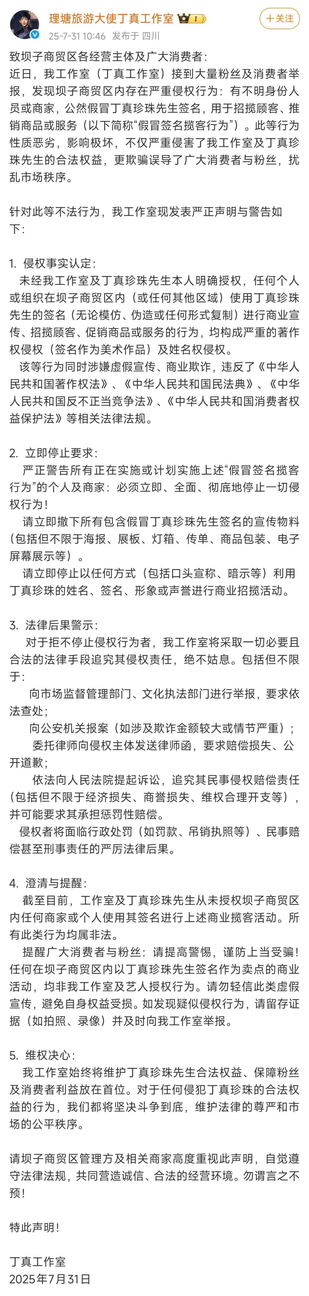 7月31日,丁真工作室發(fā)表嚴(yán)正聲明。