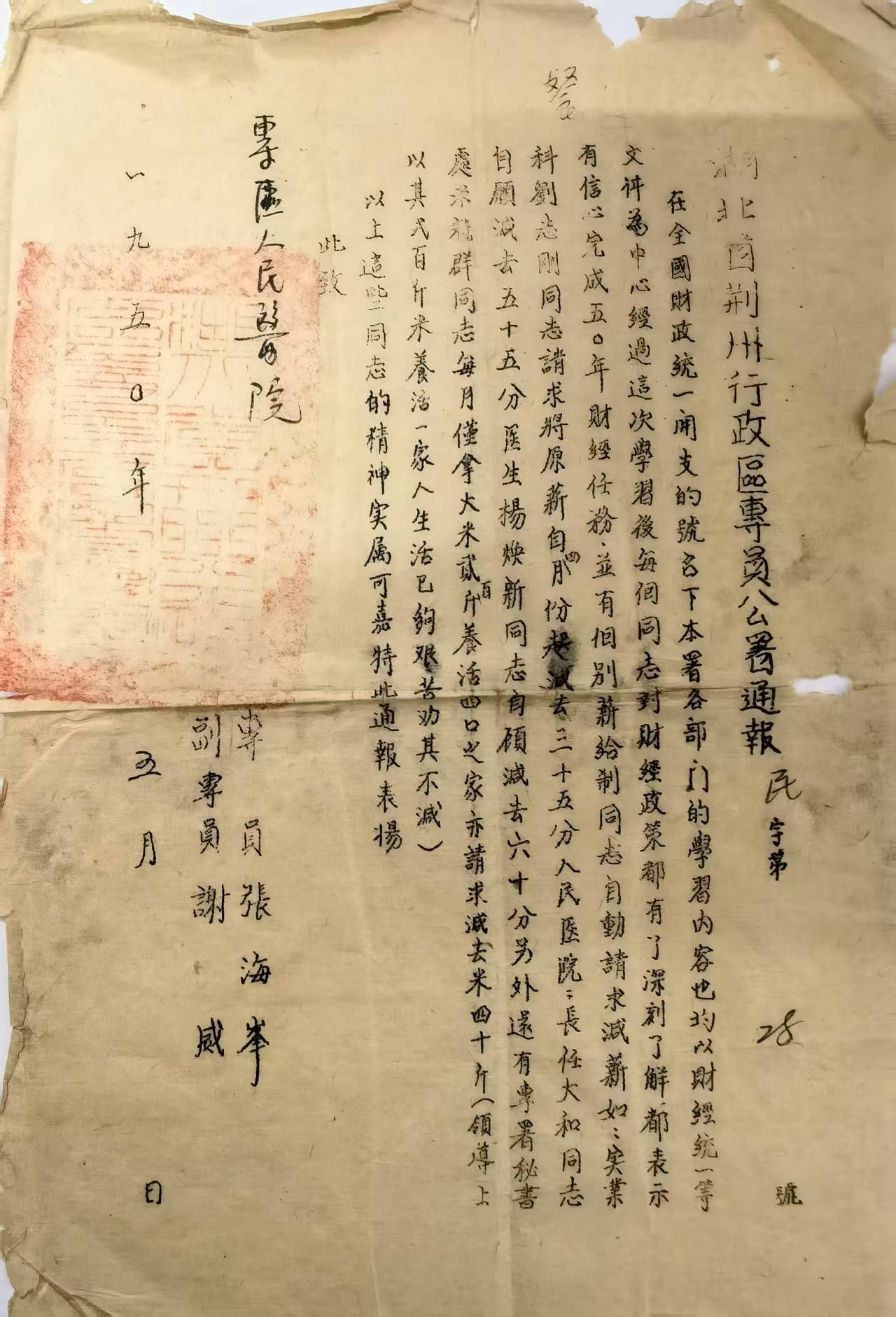 1950年3月,湖北省衛生處(后改衛生廳)任命任大和為荊州專區醫院第一任院長,那天,任大和率會計羅素芳、護士王哲英、楚麗文、田文俊、朱惠斌、杜翠、藥劑士張庭洲,一行八人肩負使命,航抵沙市碼頭。兩輛滿載行李的黃包車壓過青石板路,接收偽縣醫院以組建荊州專區醫院。