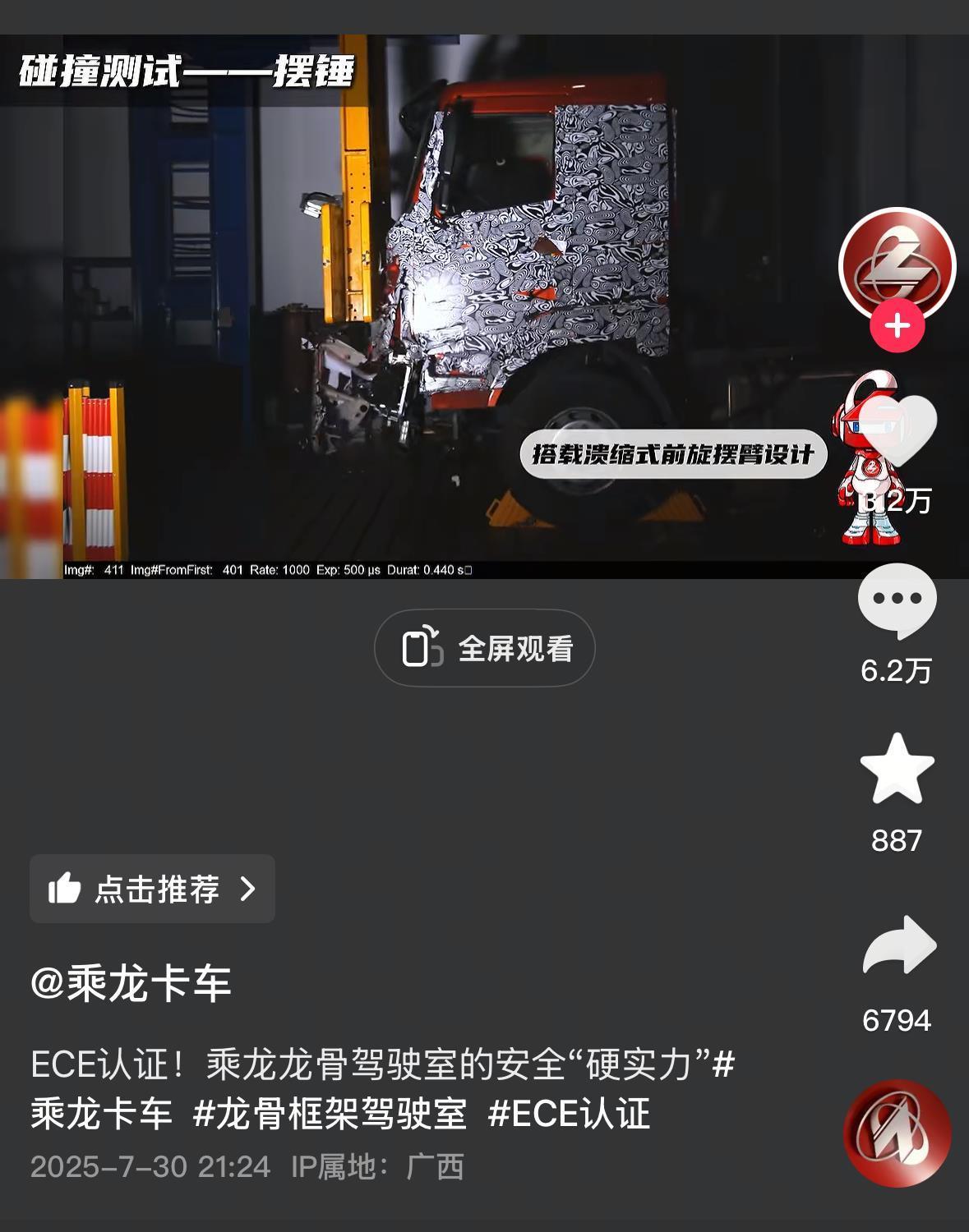乘龍卡車是東風(fēng)柳州汽車有限公司旗下的商用車品牌。兩天過去后,關(guān)于理想i8與乘龍卡車碰撞測試的討論仍在發(fā)酵。7月30日晚,乘龍卡車發(fā)布了一則視頻疑似回應(yīng)此事,視頻中展示了多個測試項目,并稱乘龍龍骨框架駕駛室,達(dá)到世界級安全品質(zhì)標(biāo)準(zhǔn)。