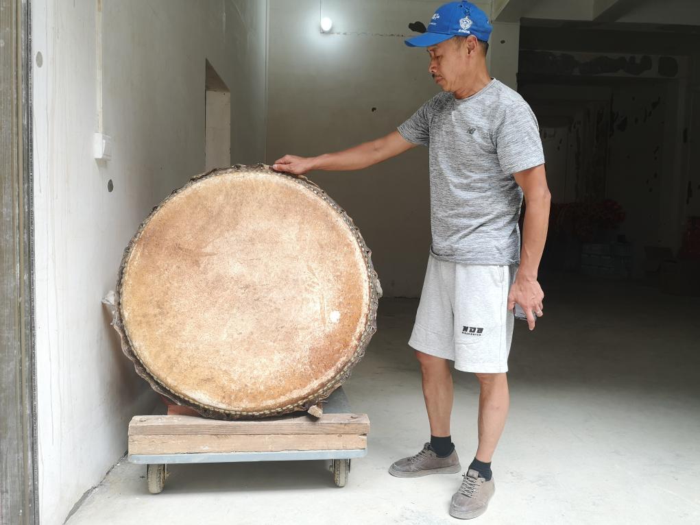 圖為7月24日楊明剛查看被洪水泡過的大鼓。新華社記者羅羽攝