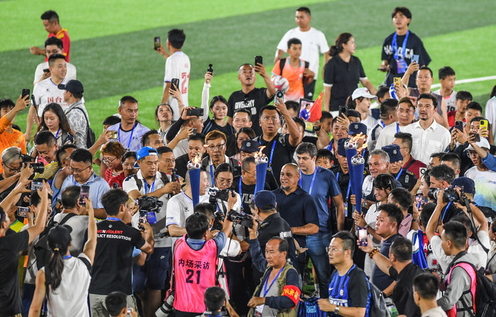 7月26日,人們在榕江“村超”球場拍攝巴喬與卡洛斯參加的“世界足球明星貴州行”啟動儀式。新華社記者楊文斌攝