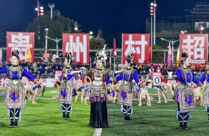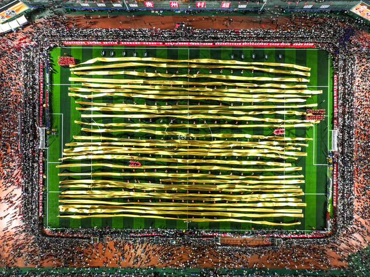 7月26日,人們在貴州“村超”球場表演節目(無人機照片)。新華社記者楊文斌攝