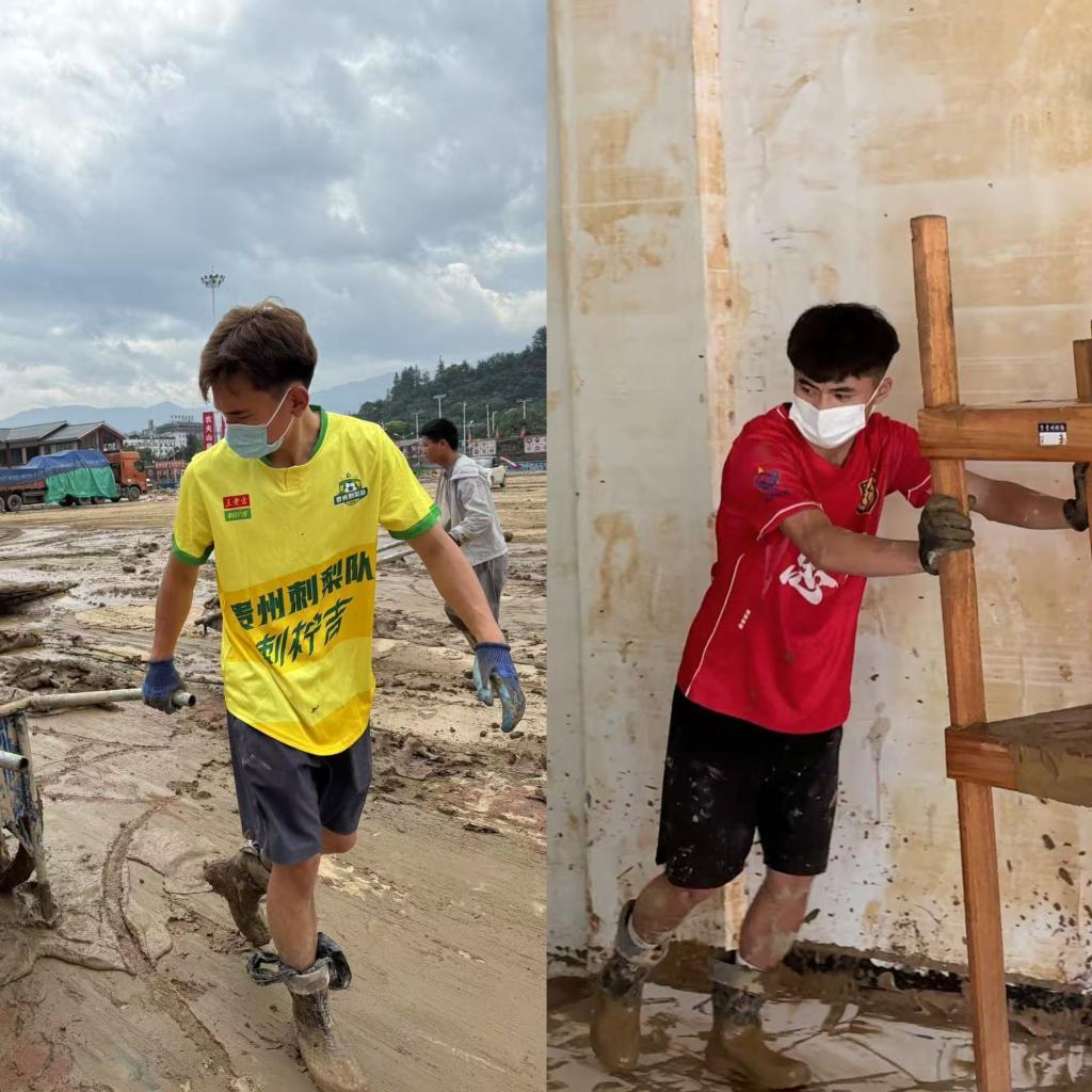 圖為“村超”球星李發雄(左)和王香兵(右)在“村超”球場救災