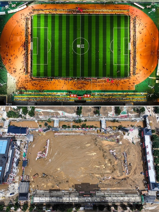 拼版照片:上圖為7月25日在貴州榕江拍攝的災后重建后的“村超”球場(無人機照片);下圖為6月25日在貴州榕江拍攝的遭受洪水襲擊的“村超”球場(無人機照片)。新華社記者楊文斌攝