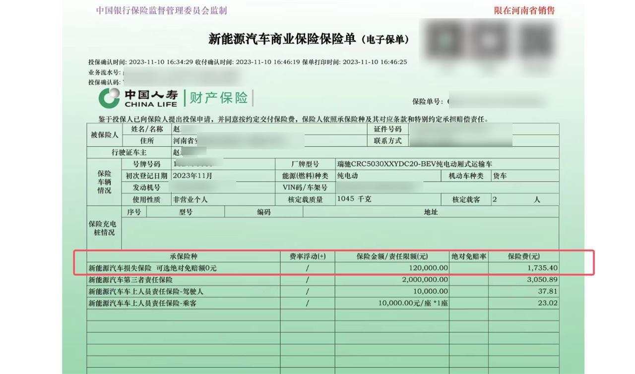 2023年11月,河南安陽的趙先生通過零首付分期貸款,購買了一輛全新的“瑞馳”牌純電動廂式運輸車,發(fā)票顯示的價稅金額合計7.7萬元。趙先生向極目新聞記者介紹,這輛車是由他在網(wǎng)上結(jié)識的一名銷售人員全權(quán)代辦,對方還發(fā)來一個二維碼讓他掃碼支付保費。支付截圖及保單顯示,他向“中國人壽財險”支付交強險和商業(yè)險費用共計6047.12元。