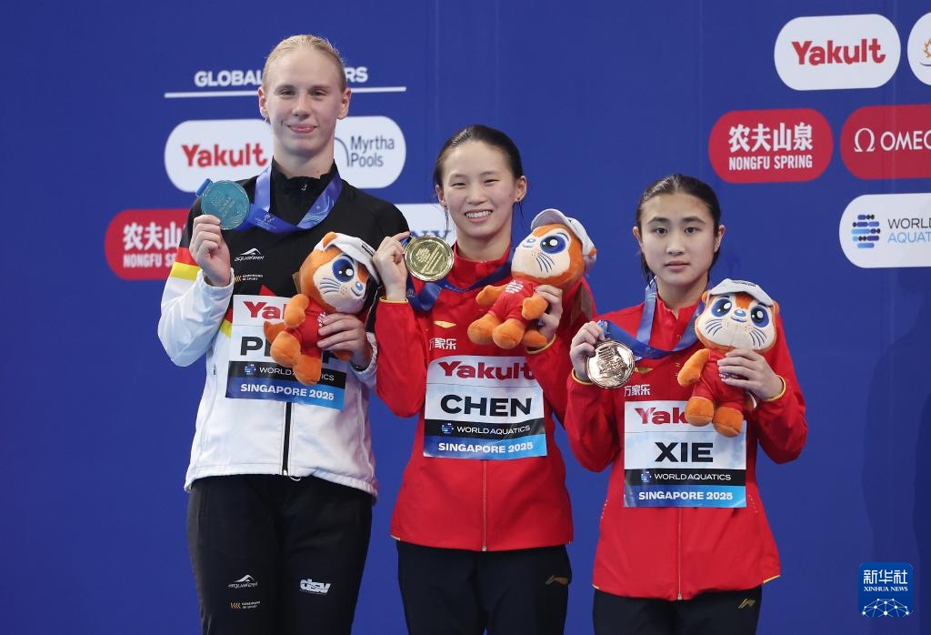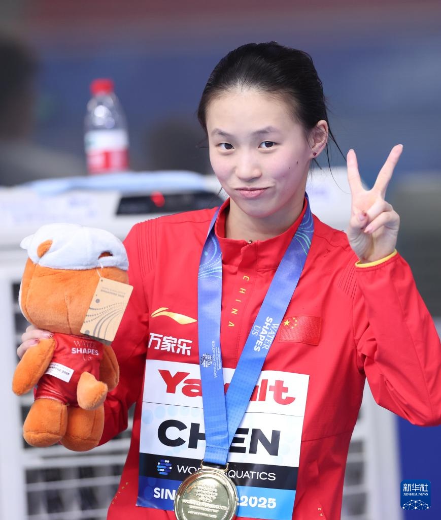 當(dāng)日,在新加坡舉行的2025年世界游泳錦標(biāo)賽跳水女子10米跳臺決賽中,中國選手陳芋汐奪冠。