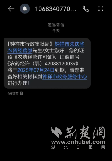 荊楚網(湖北日報網)訊(通訊員 劉燕娥)“幸虧收到了你們的短信提醒,不然錯過我店里農藥經營許可證延續期限,麻煩可就大了!”近日,在鐘祥市洋梓鎮經營農資店的朱慶華先生,因生意繁忙且辦證時間已久,險些忘記許可證延期事宜。好在他及時收到了鐘祥市行政審批局的延續換證提醒短信,趕在7月25日截止日期前,順利在市政務服務中心辦理完相關手續,領到了新的農藥經營許可證。