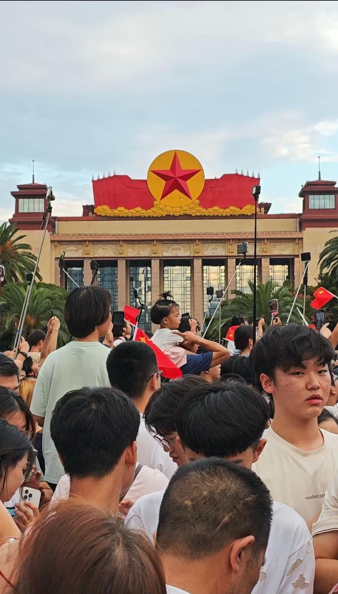 清晨6時許,八一廣場已是人潮涌動,站滿了前來觀禮的市民和游客。極目新聞記者在現場看到,不少市民游客為占據最佳位置,7月31日晚就來廣場等候,有些人甚至席地而睡剛起床,滿懷期待迎接神圣時刻。
