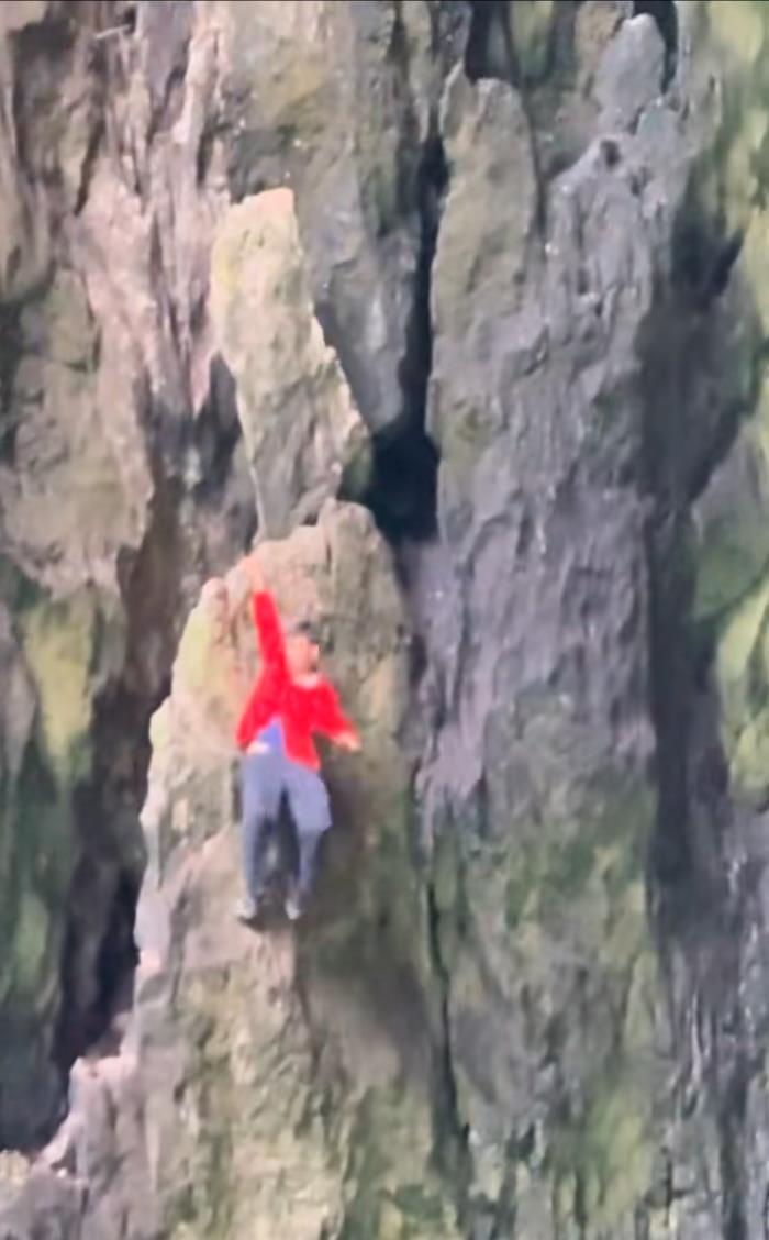 視頻顯示,一名表演的蜘蛛人在陡峭的崖壁上攀巖,下方是河流。突然間,表演者身體翻轉(zhuǎn),單手掛壁才未墜落,場面驚險(xiǎn),觀看的游客發(fā)出陣陣驚呼。