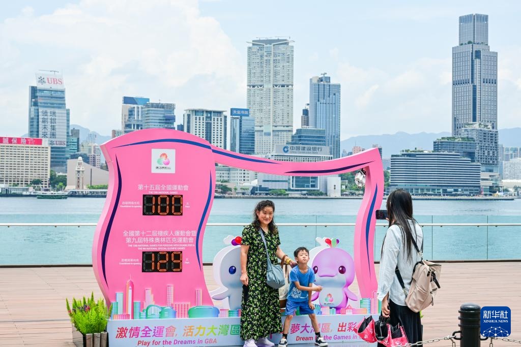 8月1日,游客在香港維港沿岸的第十五屆全國運動會倒計時牌邊合影。
