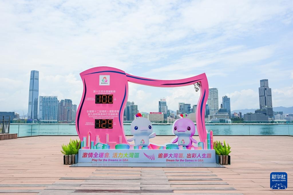 這是8月1日拍攝的香港維港沿岸的第十五屆全國運動會倒計時牌。