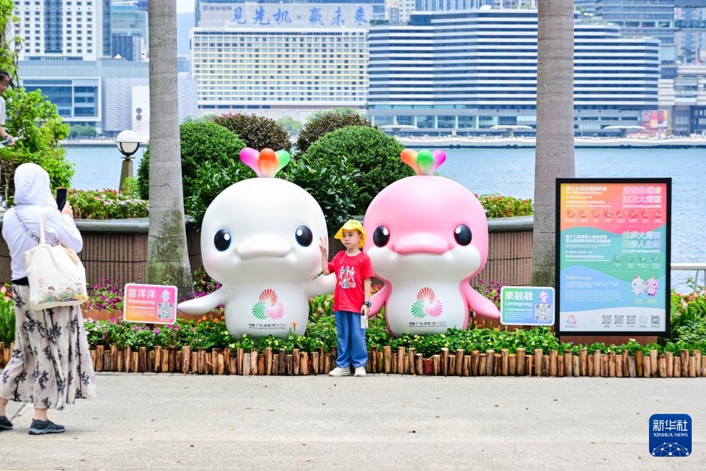 8月1日,一名兒童在香港金紫荊廣場的第十五屆全國運動會吉祥物旁留影。