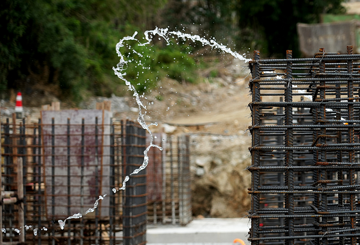 夫子河礦山工地,水龍劃出一條優(yōu)美的曲線。
