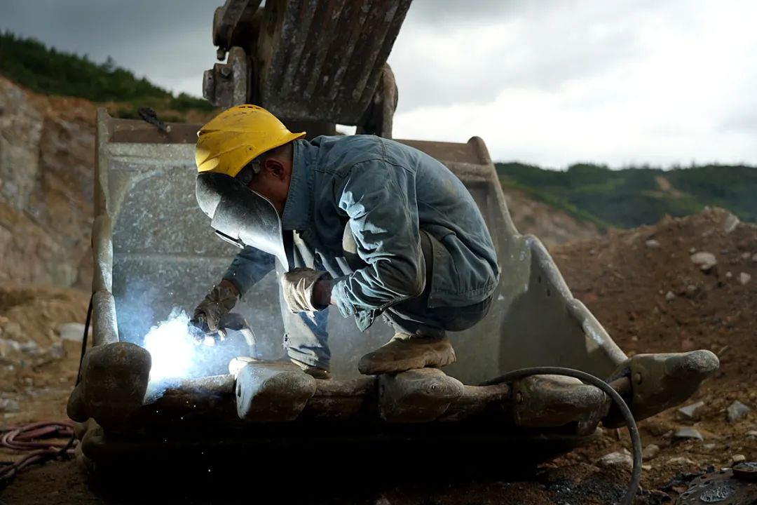 夫子河礦山采礦區(qū),一臺(tái)挖掘機(jī)發(fā)生故障,電焊工蹲在抓斗上緊急搶修。