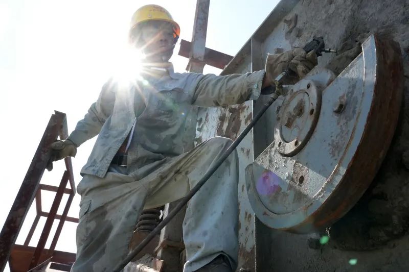 54歲的機(jī)修工余煥初正在給機(jī)器上油(黃麥嶺項(xiàng)目部)。