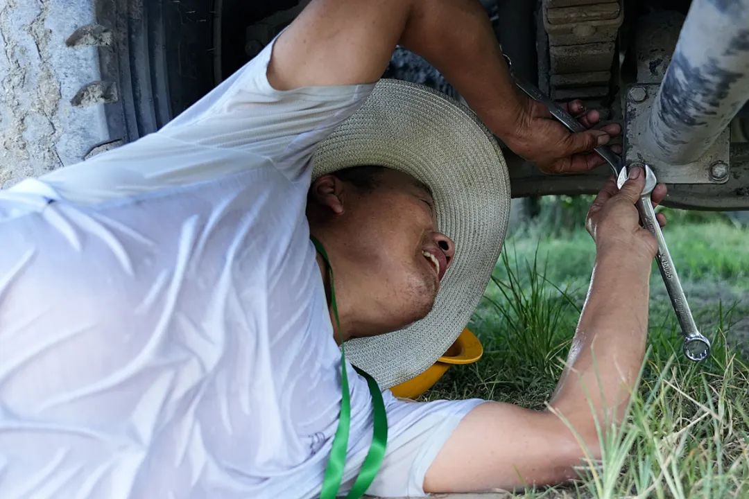 62歲的灑水車(chē)司機(jī)何章文修理車(chē)輛(黃麥嶺項(xiàng)目部)。