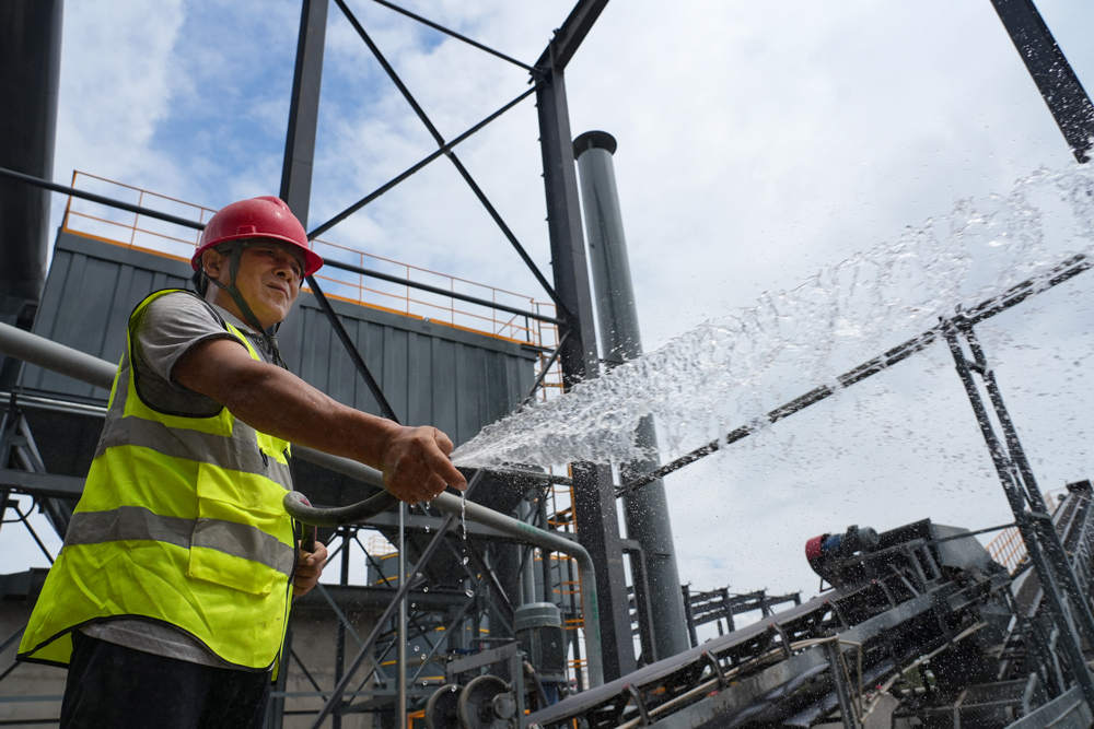 隨州公司產(chǎn)線,工人灑水清潔地面并降溫。