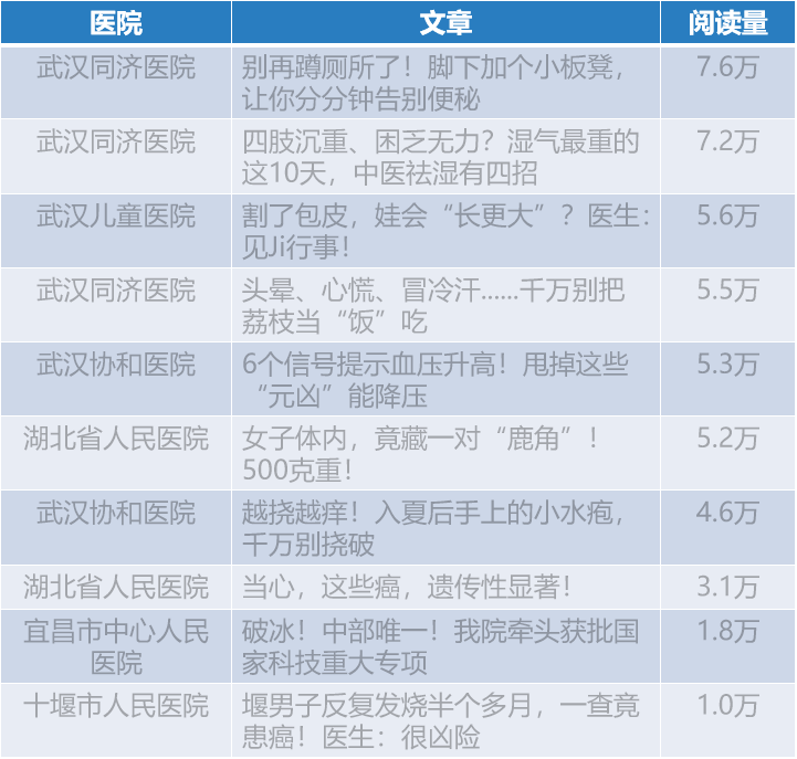 6月,湖北省第三人民醫院、武漢同濟醫院等聯合政府與社區,通過省級媒體聚焦基層醫療普惠,將相關政策、醫院服務與激勵辦法有機結合,形成公益網絡體系。湖北省第三人民醫院聯合長江新區建立殘疾人“社區-三甲”康復直通車機制,湖北省第三人民醫院將定期組織專業團隊為服務對象開展全方位康復評定,還將提供一站式健康服務,涵蓋物理檢查、心理疏導、康復咨詢等內容,同步開展知識科普講座,并為疑難病癥患者開通轉介綠色通道,全方位守護殘疾人健康。輿論稱贊這一活動不僅為當地殘疾人送去急需的康復服務,更通過構建長效健康服務體系,為基層殘疾人提供堅實可持續的醫療保障,彰顯了醫院作為公立醫院的責任擔當。6月6日,同濟醫院眼科以“守護光明踐初心,醫者仁心暖民心”為主題,在主院區、光谷院區、中法院區同步啟動大型公益行動。通過專家義診、科普宣教、多學科協作模式,為逾800名群眾提供全周期眼健康服務,以實際行動踐行“一切為了人民健康”的使命擔當。同濟醫院延續“一切為了人民健康”的公益IP,在“世界腸道健康日”節點發布《腳下加個小板凳,讓你分分鐘告別便秘》《中醫祛濕有四招》等文章,閱讀量分別達7.7萬、7.2萬;省中醫院借代茶飲上新推出《是誰還沒開始喝減肥代茶飲?》,閱讀量2.1萬。分析認為,6月相關報道將公益服務項目用“為87名殘疾人建檔”“800人義診覆蓋”等數據進行量化,通過“康復直通車”“三院區同步”等場景直觀呈現健康資源精細化路徑。在科普內容中,以“生活化場景+可立即上手的健康技巧”降低大眾獲取專業知識的門檻,構建起“線上科普一線下服務一綠色通道”的精細化公益閉環,精準呼應輿論對公立醫院公益擔當的核心期待。