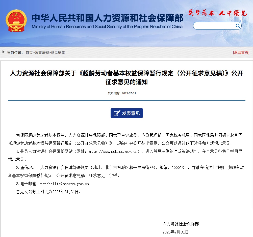 7月31日,人力資源社會(huì)保障部發(fā)布《超齡勞動(dòng)者基本權(quán)益保障暫行規(guī)定(公開征求意見稿)》,首次明確超齡勞動(dòng)者基本權(quán)益的范圍及其保障水平,并為其維權(quán)提供了法律依據(jù)。