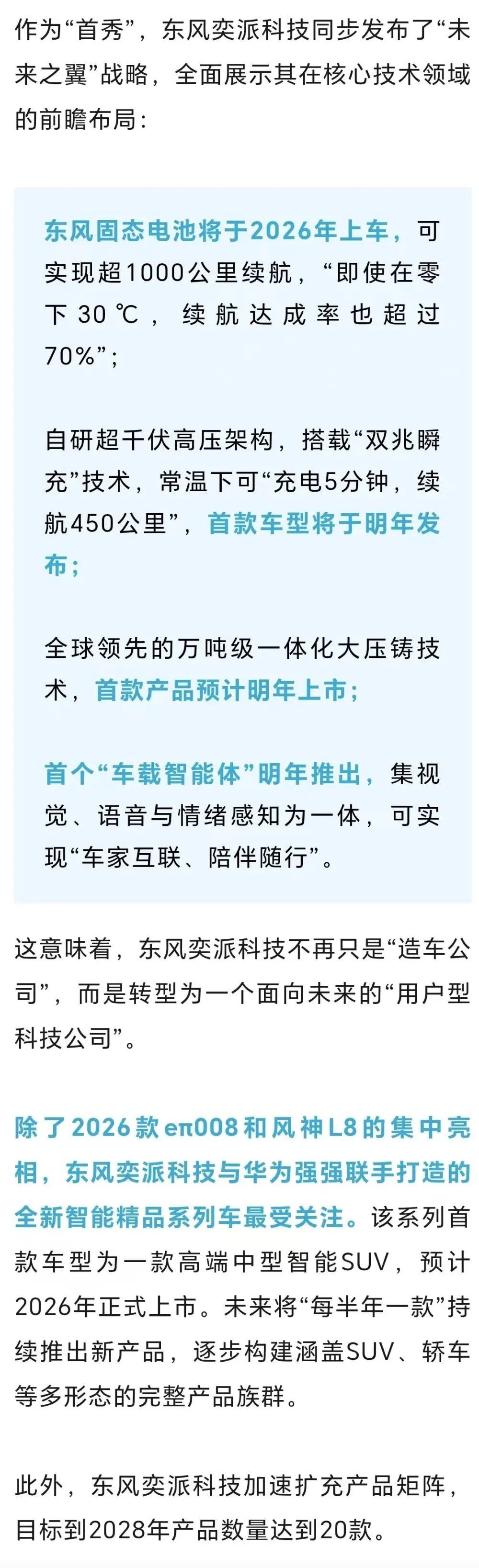 現場,東風奕派科技一口氣揭曉多個重磅信息:2026款東風奕派eπ008正式上市,限時先享價為17.36萬元~19.06萬元;風神L8迎來全球首秀。此外,東風奕派科技與華為將聯合打造一個全新智能精品系列,首款車型最快明年登場。