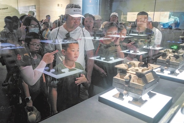 8月1日,武漢市2025年“英雄城·戎光行”系列尊崇游活動啟動。武漢市退役軍人事務局負責人表示,將以此次活動為起點,持續擦亮武漢“全國雙擁模范城”金字招牌,為推進中國式現代化武漢實踐匯聚磅礴“戎”力量。啟動儀式上,首批參加活動的15組立功現役軍人家庭收到定制挎包、水壺、望遠鏡、筆記本等禮物。之后,在退役軍人志愿者的全程護航下,他們先后參觀了湖北省博物館、武昌紅巷(武漢革命博物館),并登上長江榮耀號游船夜游長江。圖為參觀湖北省博物館情景。