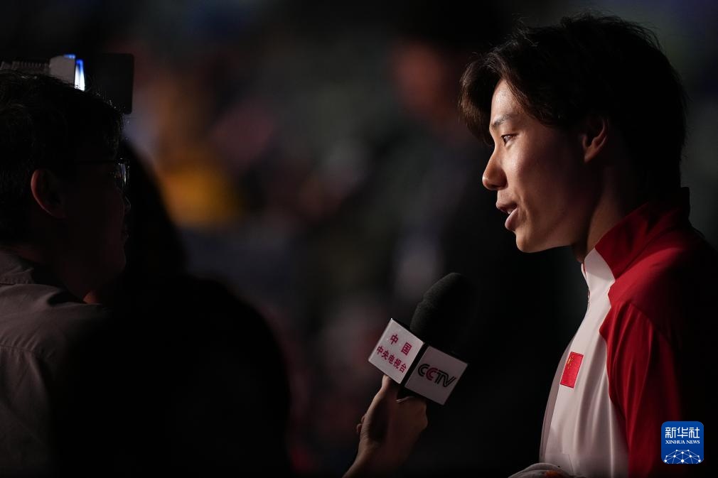 8月1日,中國選手覃海洋在頒獎儀式后接受采訪。