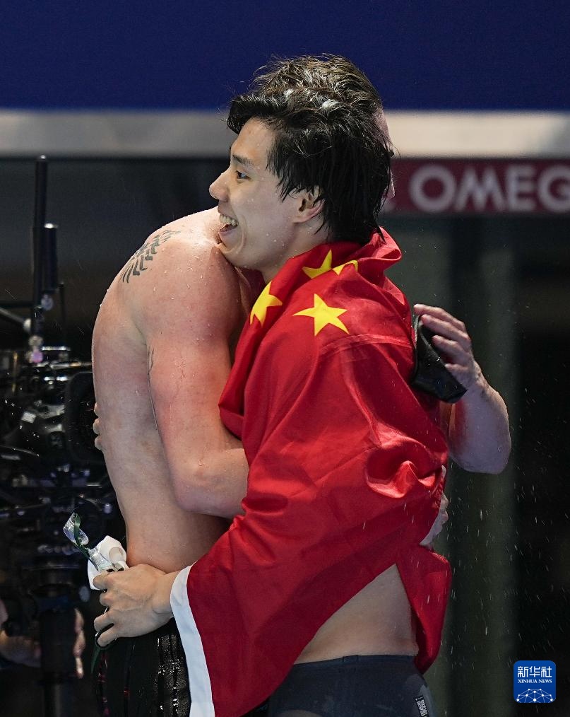 8月1日,中國選手覃海洋(右)在奪冠后慶祝。