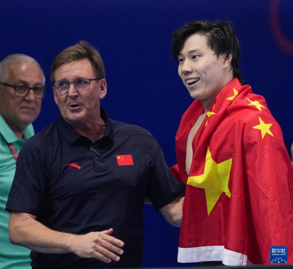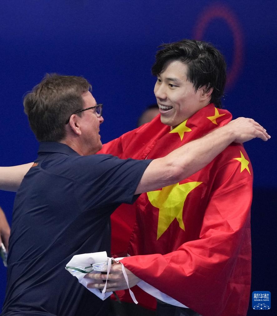 8月1日,中國選手覃海洋(右)在奪冠后接受祝賀。