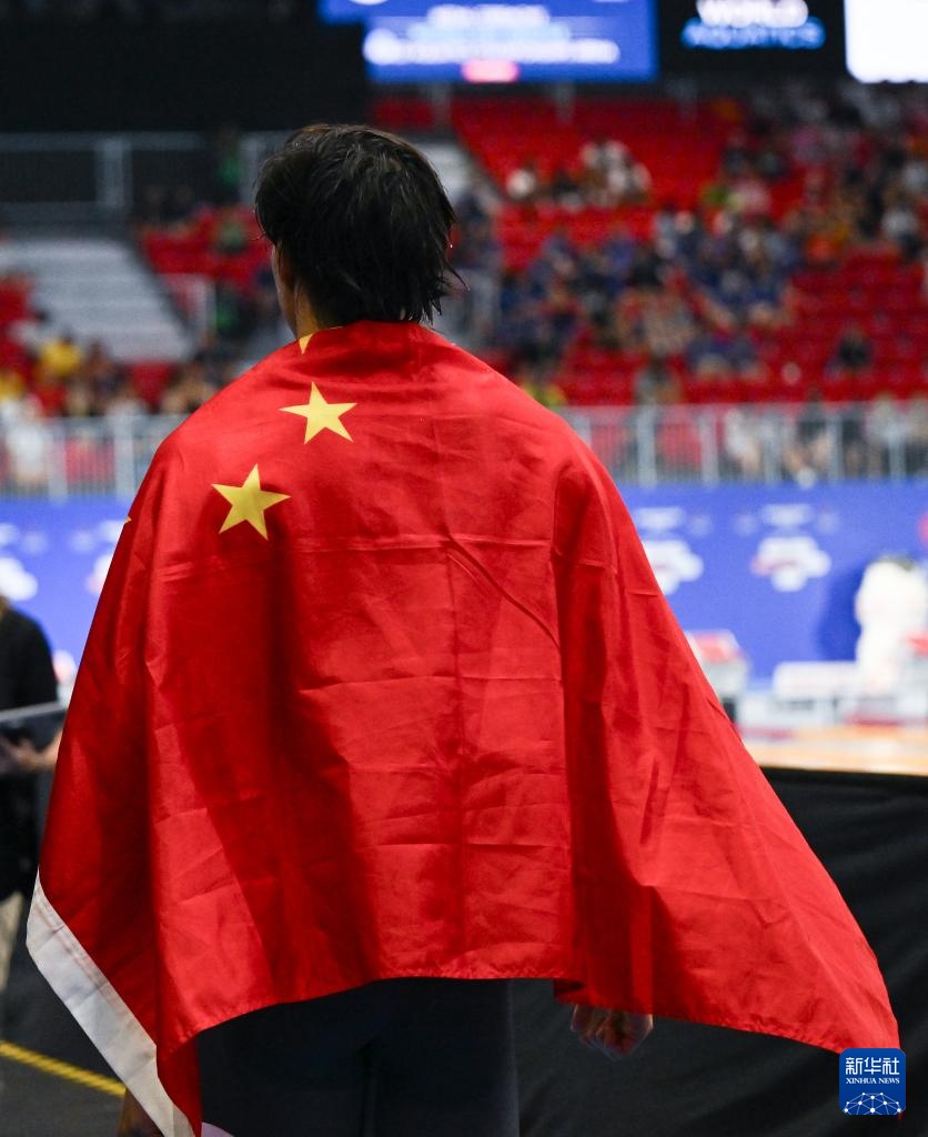 8月1日,冠軍中國選手覃海洋在頒獎儀式上。